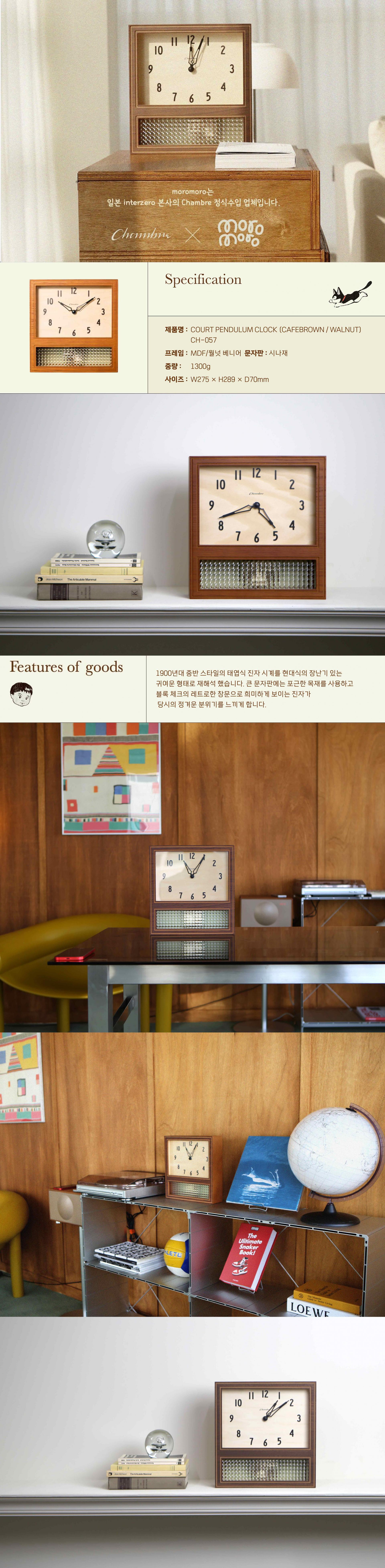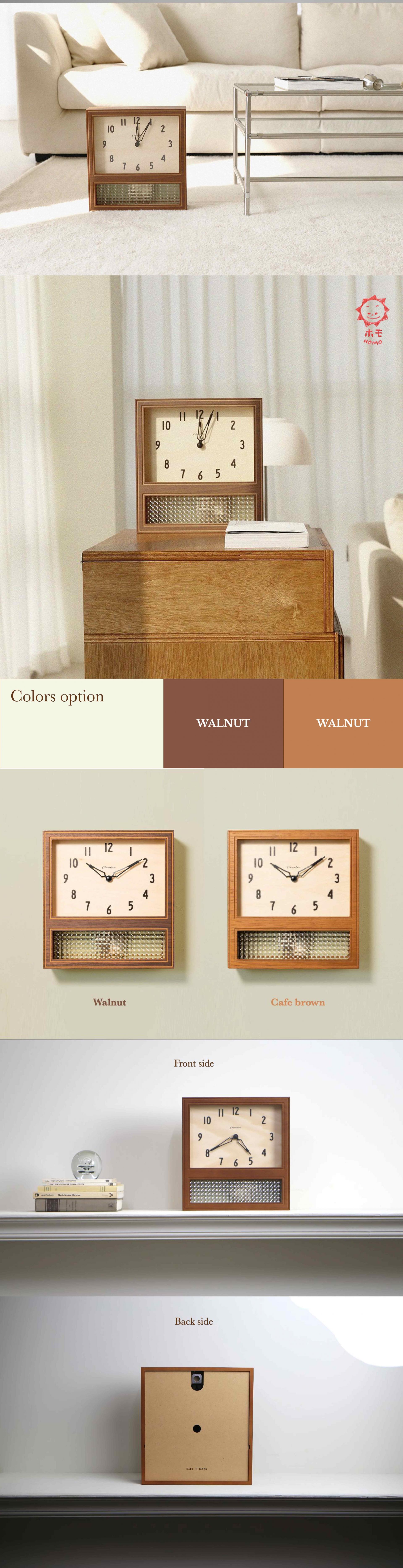 큰 문자판에는 포근한 목재를 사용하고 블록 체크의 레트로한 창문으로 희미하게 보이는 진자가 당시의 정겨운 분위기를 느끼게 합니다.